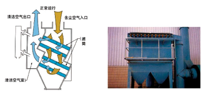 當(dāng)濾筒表明捕集的粉塵達(dá)到一定數(shù)量時(shí),濾筒的過濾阻力也隨之達(dá)到某一定值時(shí),控制閥將自動打開,壓力空氣直接沖入濾筒中心,把捕集在濾筒表面的粉塵吹凈,粉塵在重力的作用下,隨著氣流下沉集塵斗中。。